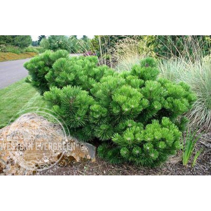 Augalas formuoja tankų, platus krūmo ar nedidelio medžio formos vainiką. Per 10 metų paprastai pasiekia apie 2–3 m aukštį ir panašų plotį, tačiau gali augti ir didesnis. Spygliai ilgi, standūs, tamsiai žali, augantys poromis ir sudarantys labai tankią struktūrą. Pavasarį išsiskiria ryškūs, šviesūs nauji ūgliai („žvakės“), kurie suteikia augalui papildomo dekoratyvumo.